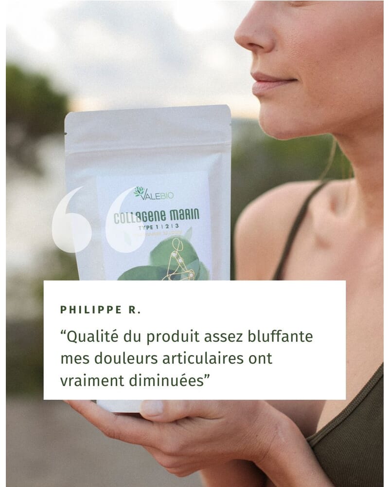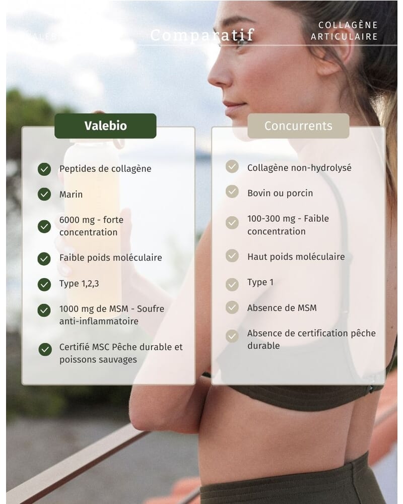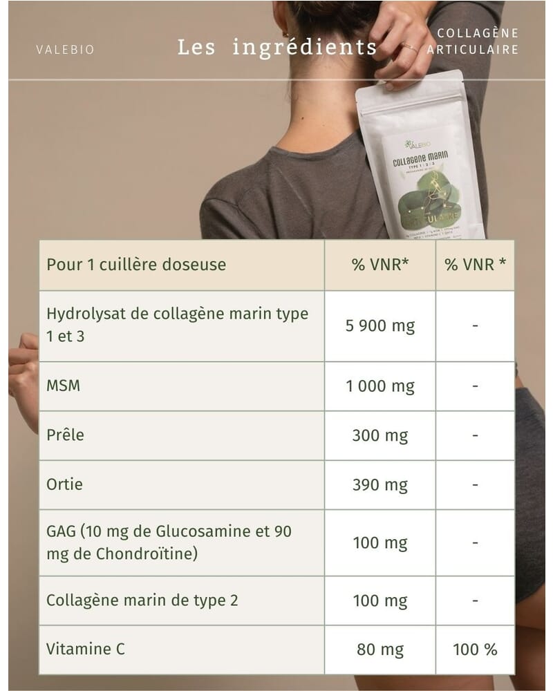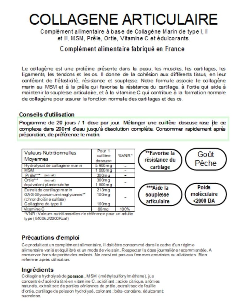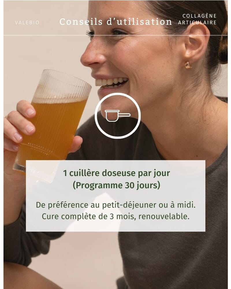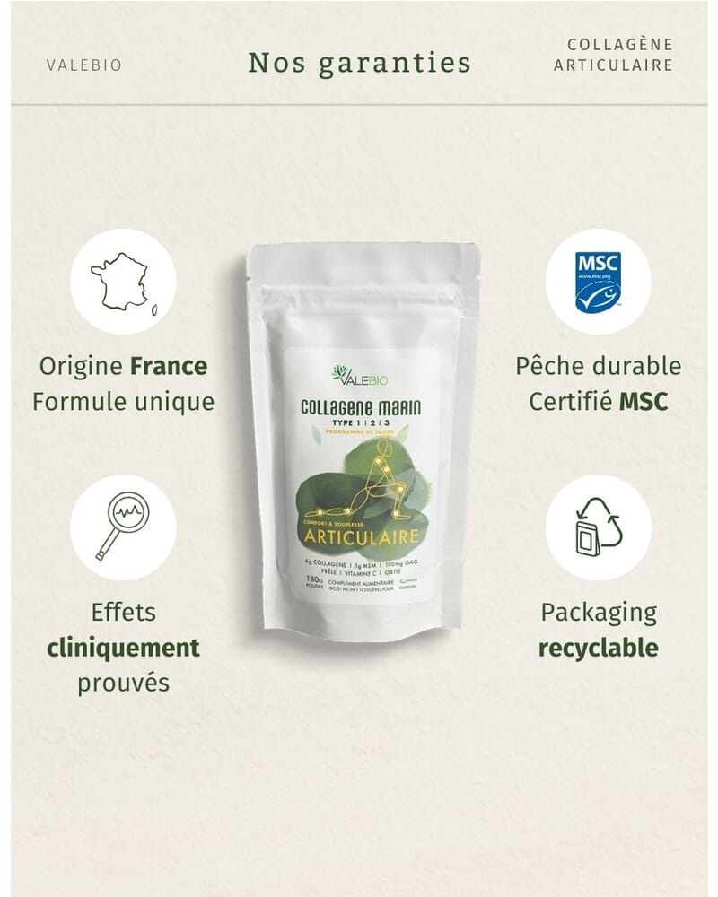 - Une action cliniquement prouvée : Des études cliniques démontrent les effets bénéfiques du collagène marin sur la santé articulaire, avec une amélioration visible dès quelques semaines.