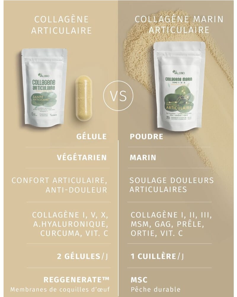 Le collagène articulaire en poudre est très dosé en MSM, un actif anti inflammatoire. Il est particulièrement recommandé pour soulager les douleurs importantes. En revanche, le collagène en gélules, issu de coquilles d’œufs, est parfait pour un traitement de fond. Il convient aux végétariens et aux personnes sensibles au goût du collagène marin.Au bout de combien de temps puis-je renouveler ma cure ?