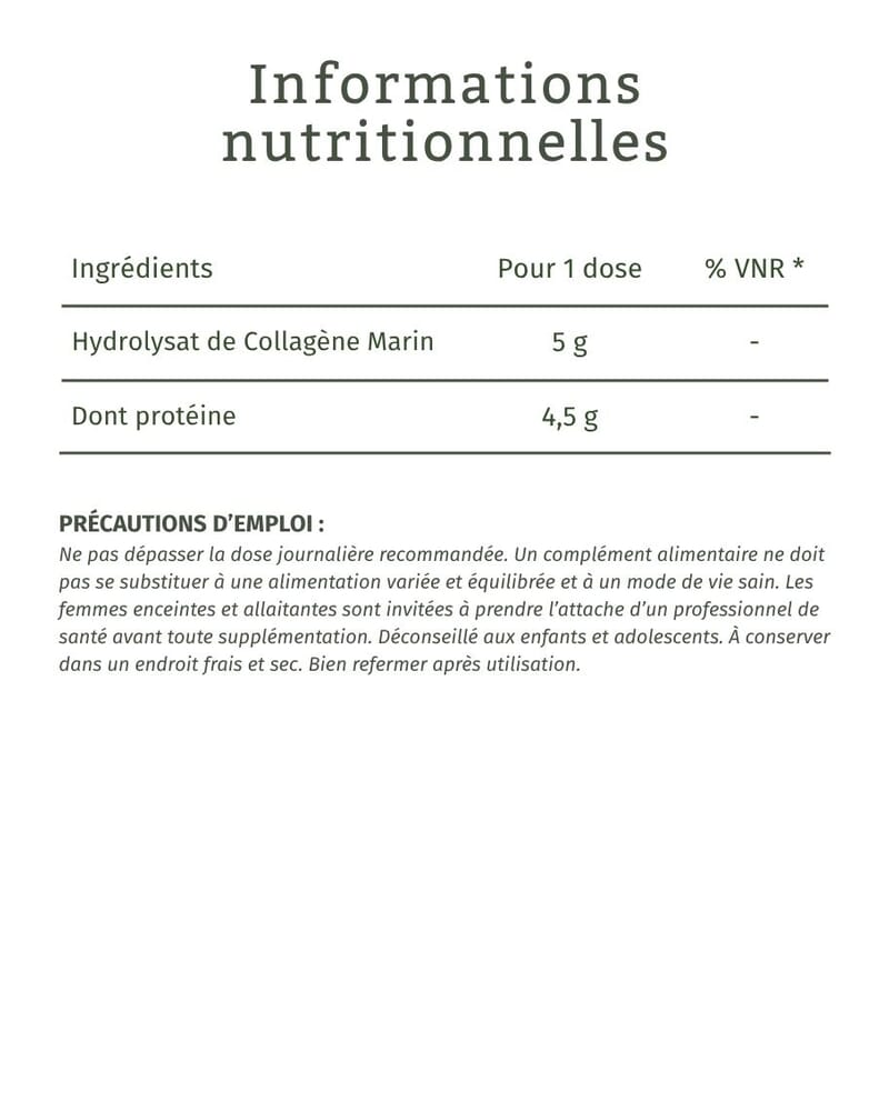 Collagène de type 3Présent dans les tissus souples (vaisseaux, muscles). Il soutient la souplesse et la régénération des tissus.Pour 1 dose % VNR* Hydrolysat de Collagène Marin