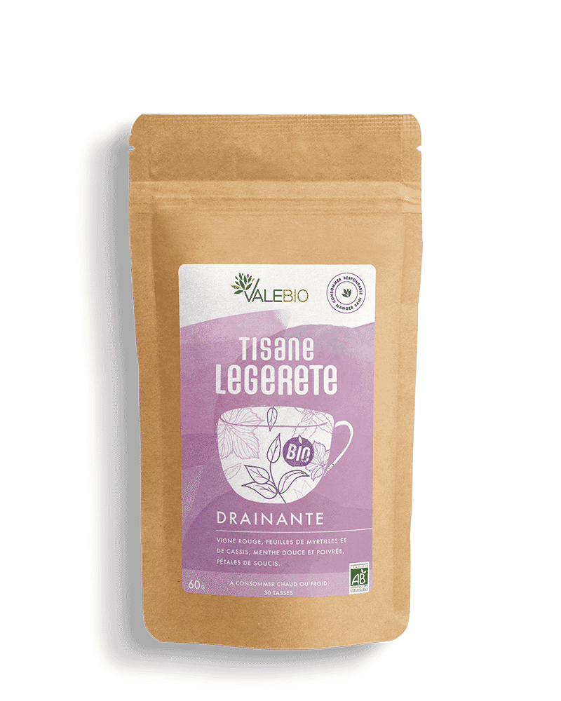 Peut-on boire plusieurs tasses par jour ?Notre tisane a essentiellement des vertus drainantes, alors oui vous pouvez consommer 1 à 3 tasses par jour sans problème.Votre tisane est-elle bio ?Oui notre tisane est 100% BIO, elle est composée de vigne rouge bio, feuilles de myrtille BIO, feuilles de cassis BIO, menthe douce bio, menthe poivrée BIO, pétales de soucis BIO.Peut-on associer cette tisane avec d'autres produits ?Cette tisane peut se consommer seule en raison de ses bienfaits drainants. Elle peut également se consommer en synergie avec notre complexe ménopause pour un effet optimal.A quel moment de la journée peut-on la consommer ?De par ses propriétés drainantes, nous vous conseillons d’éviter sa consommation le soir. Néanmoins chacun.e est différent.e, cela est donc à voir au cas par cas.Est ce que le mode de consommation chaud ou froid influe sur les propriétés de cette tisane ?Le mode de consommation n’influe pas sur les bienfaits des plantes. Néanmoins si vous consommez votre tisane chaude, attention à ne pas faire bouillir l’eau afin de préserver les propriétés et les arômes des plantes.Est ce que cette tisane a une action phyto hormonale ?Cette tisane a été conçue pour être utilisée en complémentarité de notre complexe ménopause. Il n’y a donc aucune action phyto-hormonale.Peut-on consommer cette tisane en cas de lourds traitements médicamenteux ?Notre tisane est 100% naturelle, néanmoins les plantes peuvent avoir certaines contre-indications. Selon vos antécédents, vos pathologies ou vos traitements en cours, veuillez prendre conseil auprès de votre médecin référent ou auprès d’un professionnel de santé.Comment doser les deux grammes par jour recommandés ?Deux grammes par jour représentent une cuillère à café.Dans quel cas puis-je consommer cette tisane Légèreté ?Notre tisane convient à toutes les personnes souhaitant drainer leurs organisme et souffrant de jambes lourdes. -