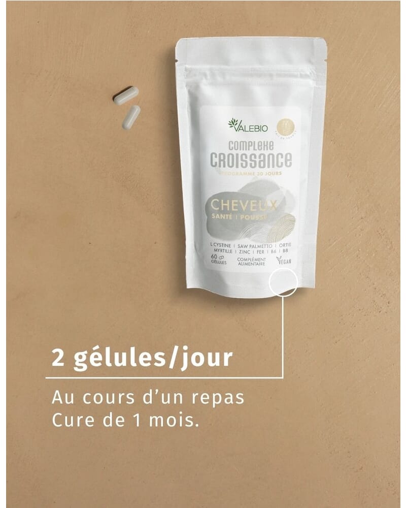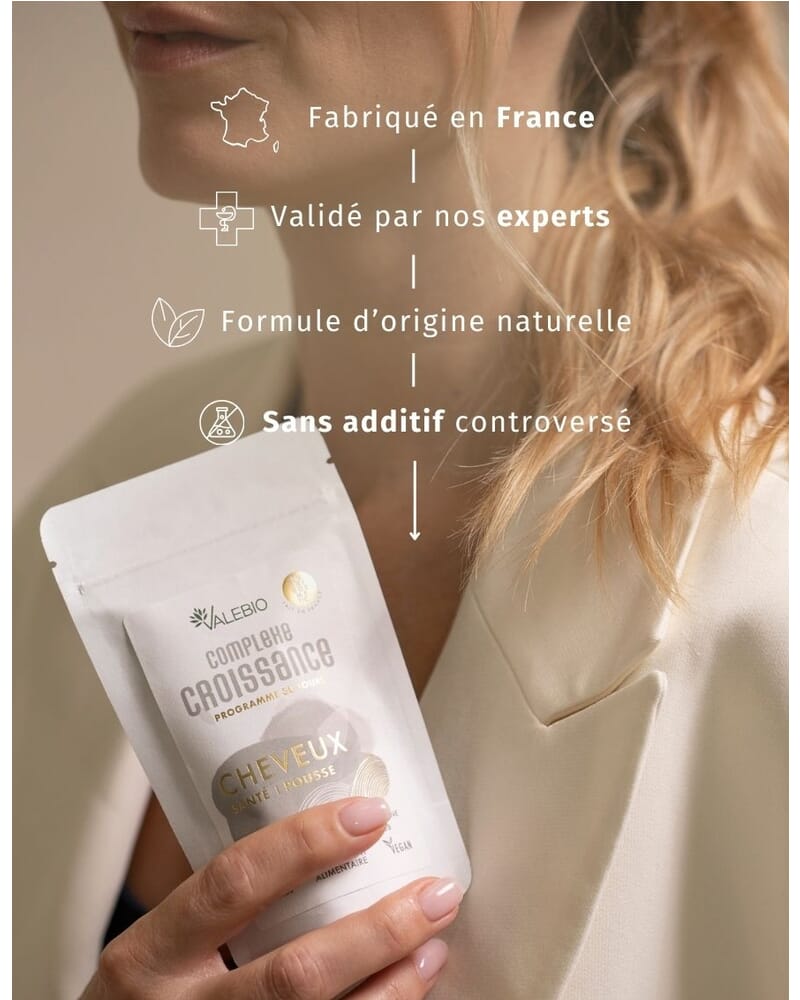 C’est pour répondre à ce besoin que nous avons créé le Complexe Croissance Valebio® : un complément alimentaire clean et efficace, formulé pour freiner la chute des cheveux et stimuler leur croissance de manière naturelle.