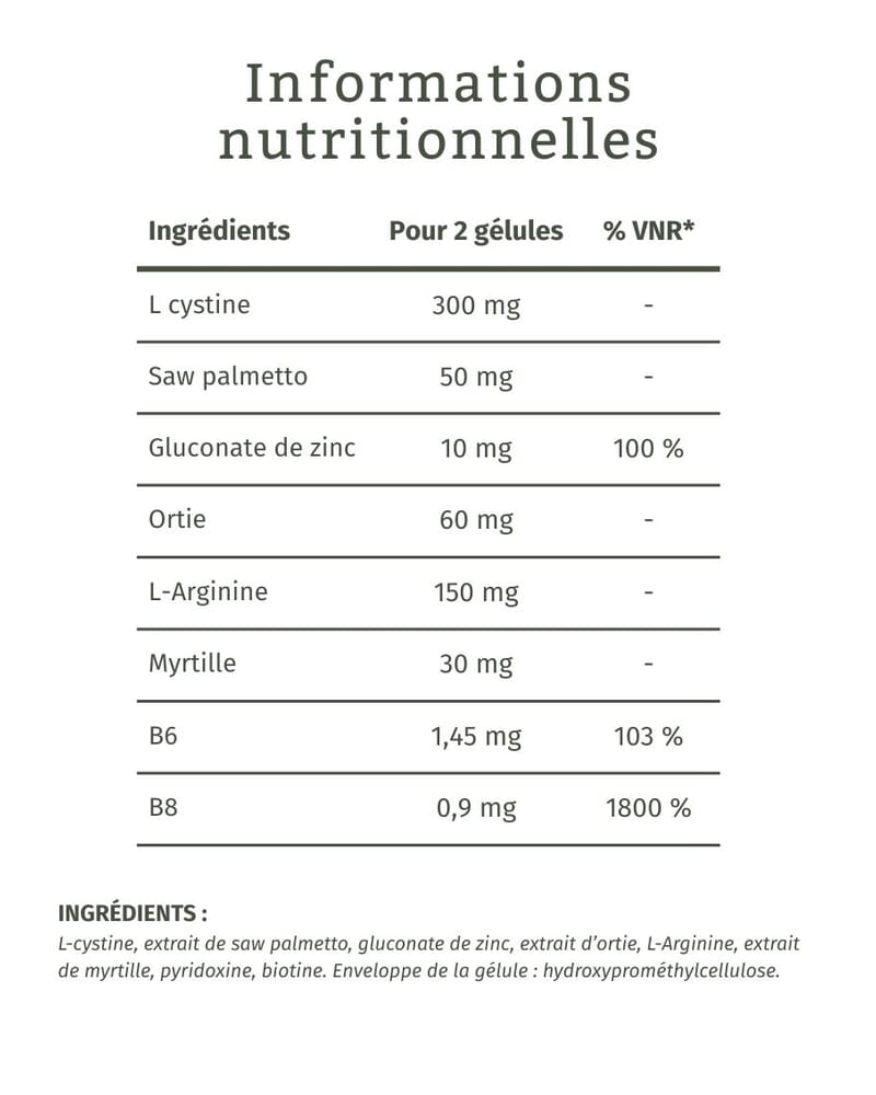 Ingrédients : L-cystine, extrait de saw palmetto, gluconate de zinc, extrait d’ortie, L-Arginine, extrait de myrtille, pyridoxine, biotine. Enveloppe de la gélule : hydroxyprométhylcellulose.