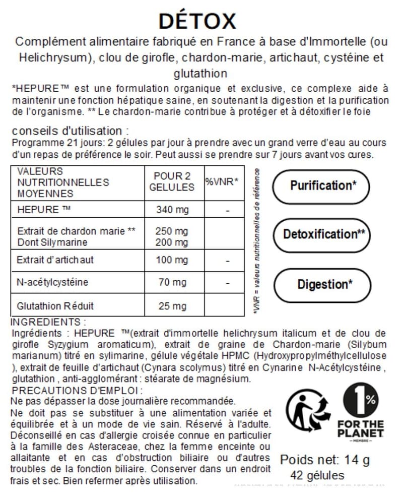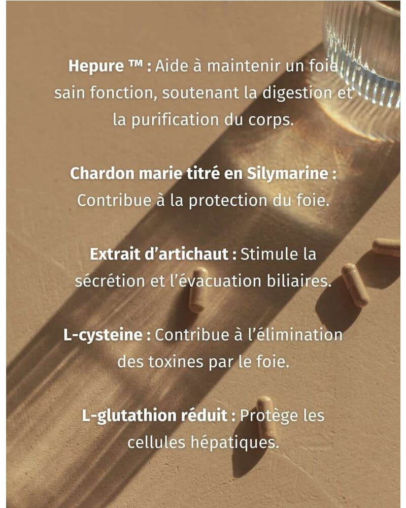 GlutathionProtège les cellules hépatiques contre le stress oxydatif, contribuant ainsi à une meilleure protection.Ingrédients Quantité / 2 gélules % VNR Hepure™ 340 mg - Extrait de chardon-marie 250 mg - Dont silymarine 200 mg - Extrait d’artichaut 100 mg - N-acétylcystéine 70 mg - Glutathion réduit 25 mg - Ingrédients : HEPURE ™ (extrait d'immortelle helichrysum italicum et de clou de girofle Syzygium aromaticum), extrait de graine de Chardon-marie (Silybum marianum) titré en sylimarine, gélule végétale HPMC (Hydroxypropylméthylcellulose), extrait de feuille d’artichaut (Cynara scolymus) titré en Cynarine N-Acétylcystéine, glutathion, anti-agglomérant : stéarate de magnésium.
