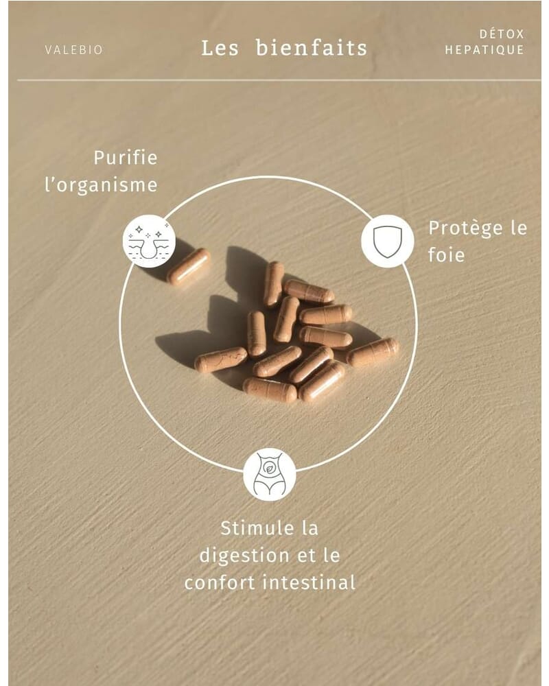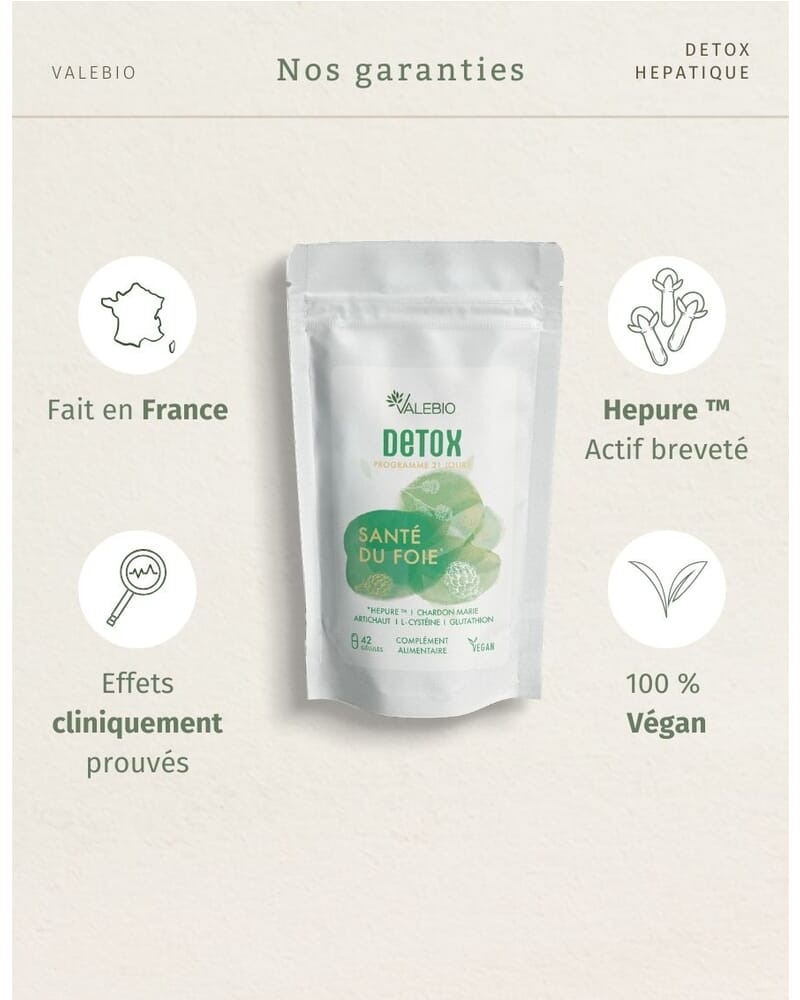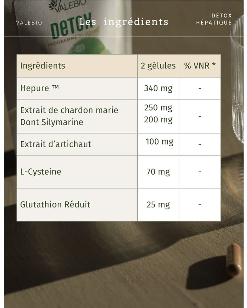 La Détox Hépatique Valebio® combine des actifs brevetés comme Hepure™, des plantes comme le chardon-marie titré en silymarine et le glutathion pour une action ciblée sur le foie, avec un packaging écoresponsable et une formule 100 % vegan.