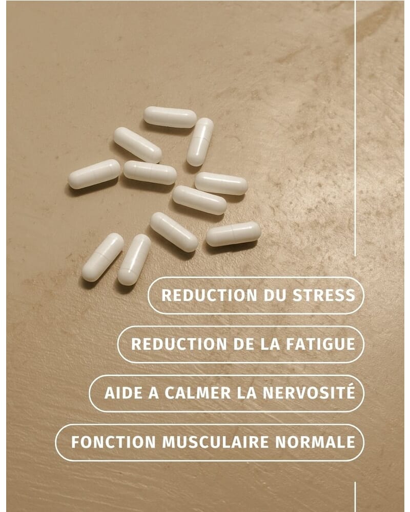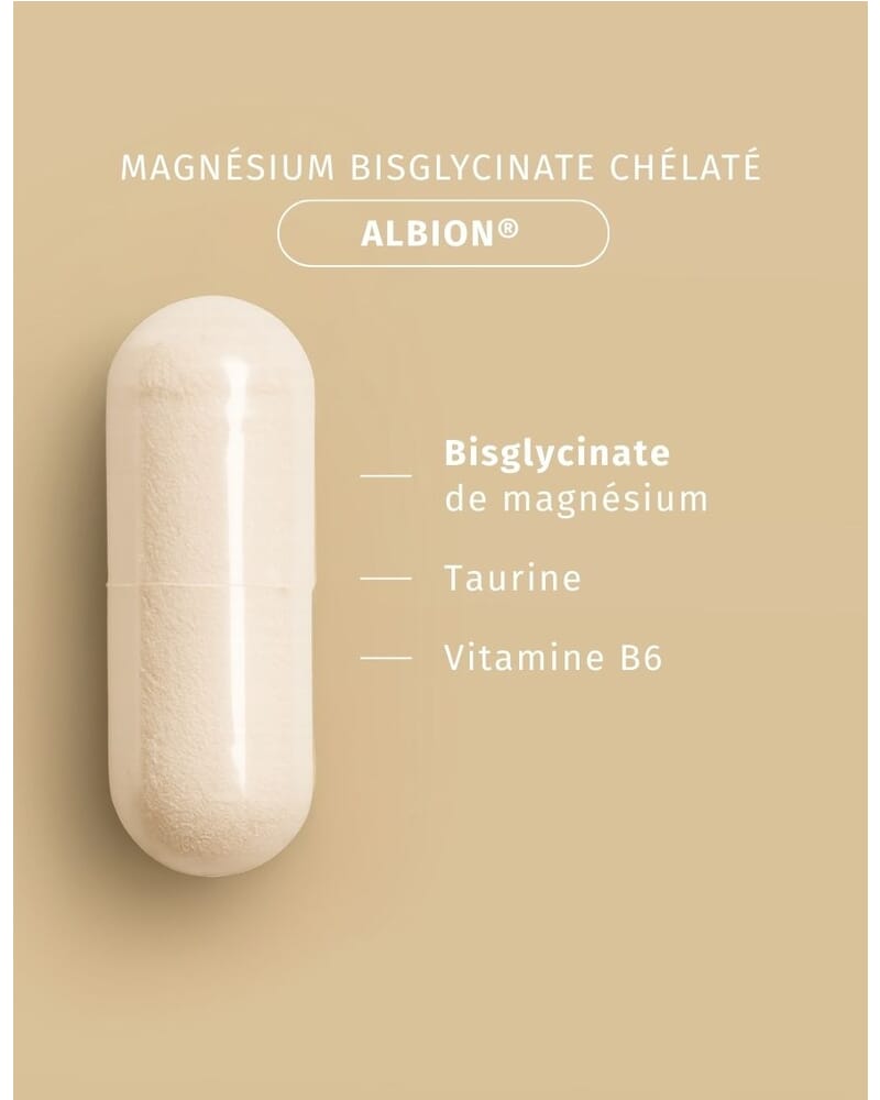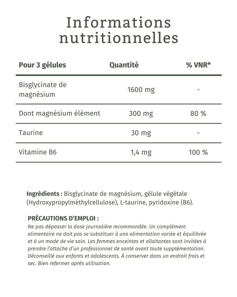 Ingrédients : Bisglycinate de magnésium, gélule végétale (Hydroxypropylméthylcellulose), L-taurine, pyridoxine (B6).