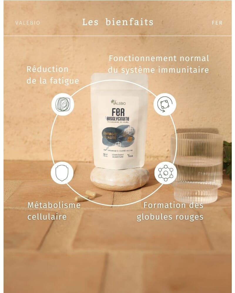 Notre cure de Fer peut être associée à d'autres compléments alimentaires Valebio, tels que nos produits à base de magnésium ou de vitamine D, pour une santé globale optimale. Consultez toujours un professionnel de santé pour des conseils personnalisés. -