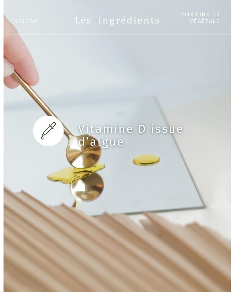 Notre Vitamine D3 n’est pas d’origine animale, elle n’est pas issue de lanoline.Nous avons fait le choix de partir sur une Vitamine D3 d’origine 100 % végétale (algue).