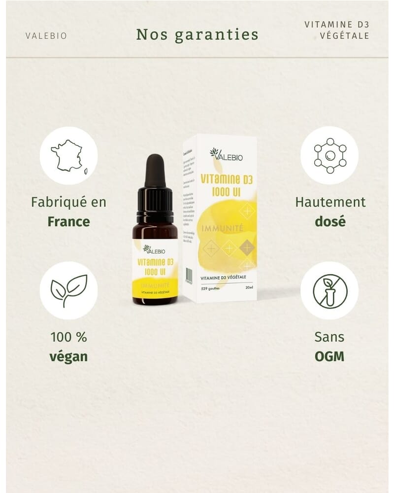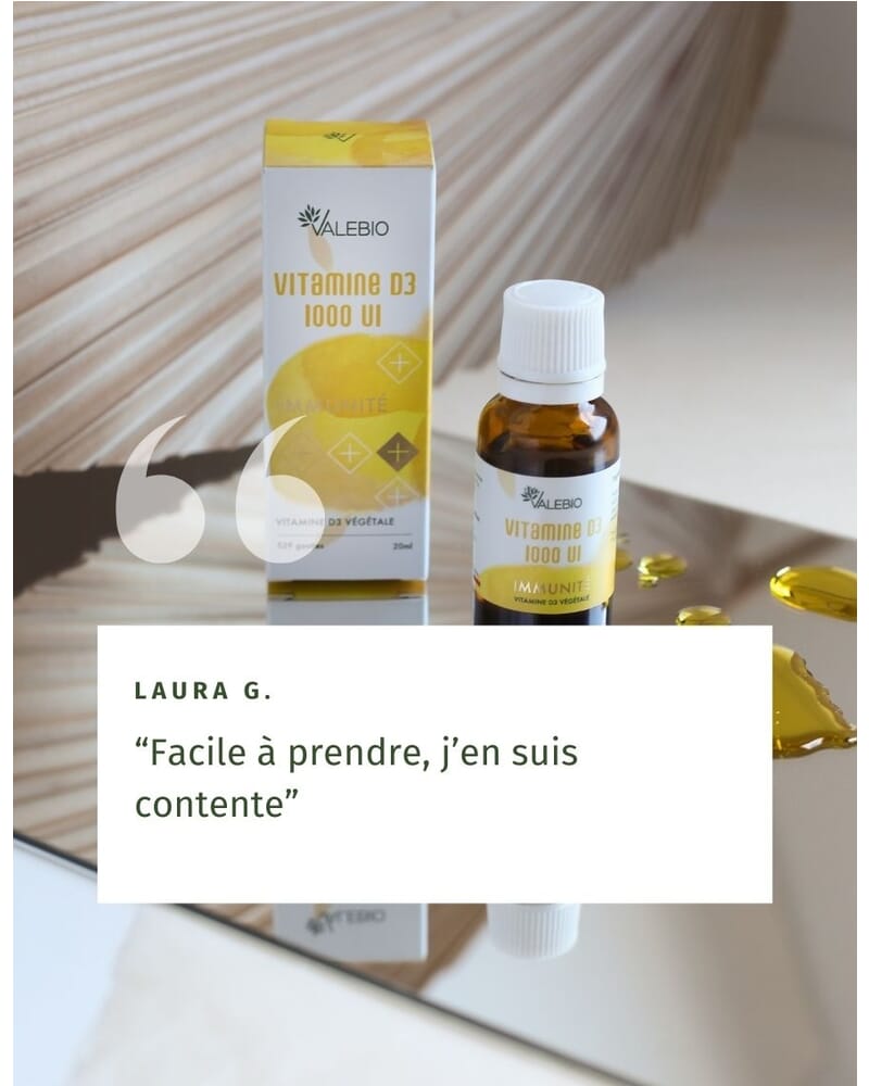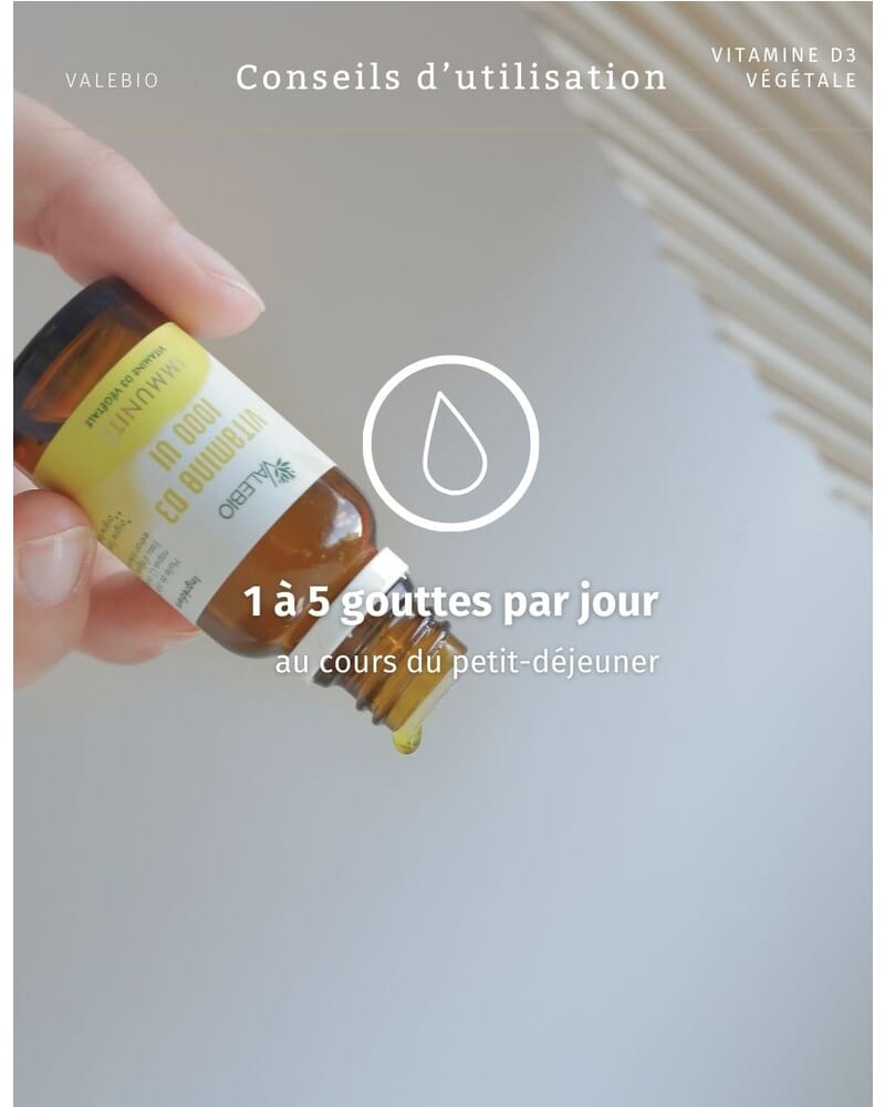 - Programme flexible : 1 à 5 gouttes par jour (1000 UI) pour une cure de 3 mois, flacon compte-goutte pratique.