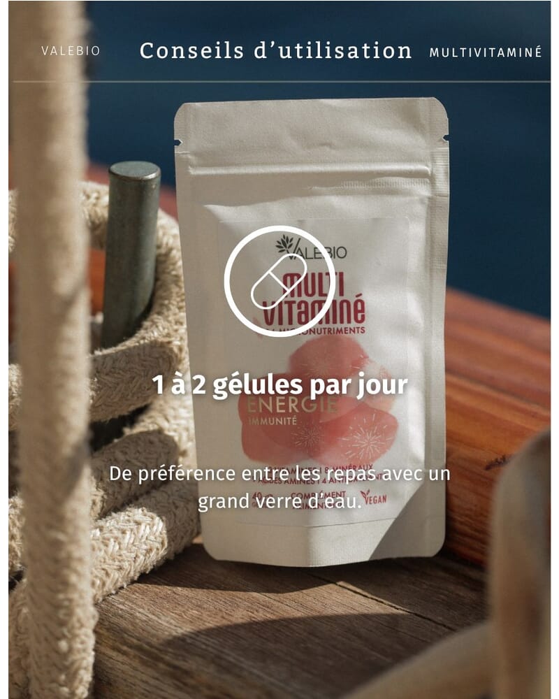 Pour profiter pleinement des bienfaits de notre Multivitaminé, nous vous recommandons de prendre 1 à 2 gélules par jour, entre les repas avec un grand verre d'eau.