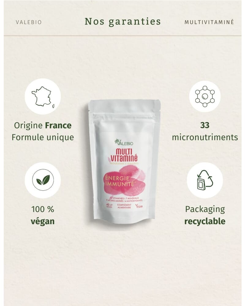Notre packaging est entièrement recyclable, contribuant ainsi à la réduction des déchets et à la préservation de notre planète.Avec quels autres compléments alimentaires Valebio associer cette cure multivitaminée ?