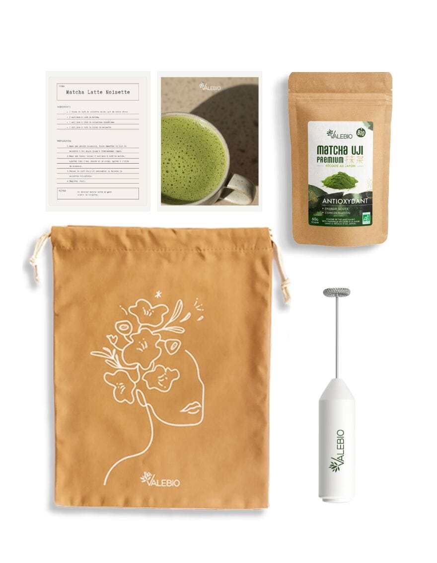 - À l'intérieur : 1 sachet de Matcha Uji Premium + 1 mousseur électrique + 1 carte recette + 1 pochon
