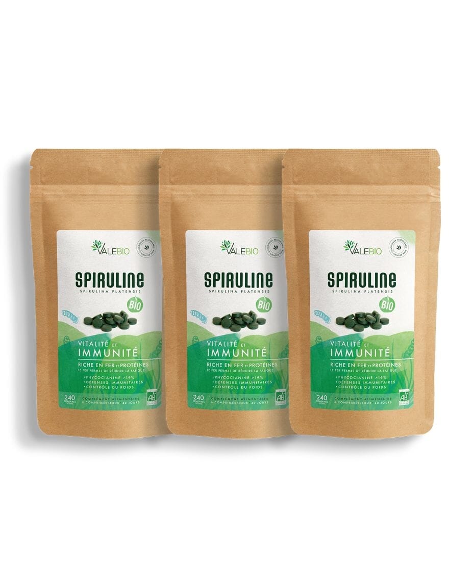 La spiruline Valebio® peut être consommée toute l’année à raison de 3g à 6g par jour, soit 6 à 12 comprimés. Il est conseillé de commencer à 1 g par jour et d’augmenter progressivement les doses. (1g = 2 comprimés)