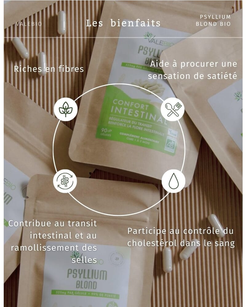 - Transit optimisé : régule naturellement le transit, ramollit les selles, aide à contrôler le cholestérol et procure une sensation de satiété.