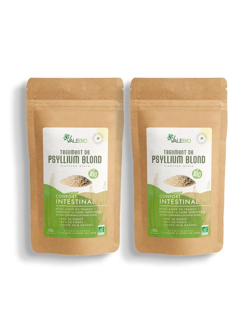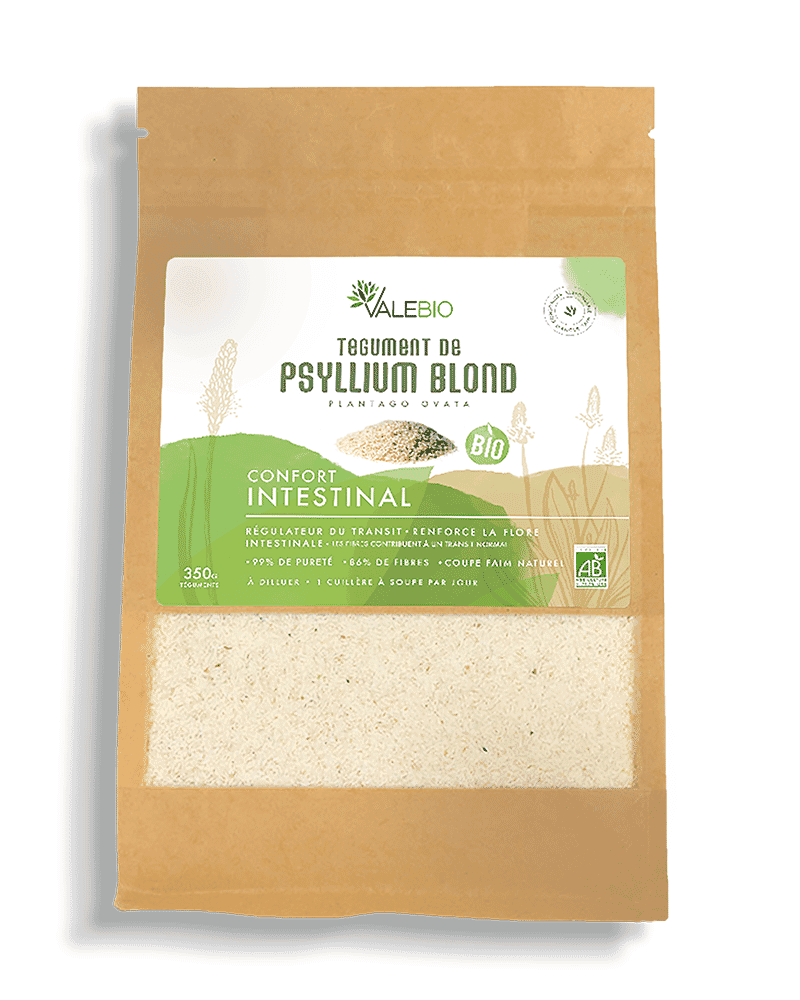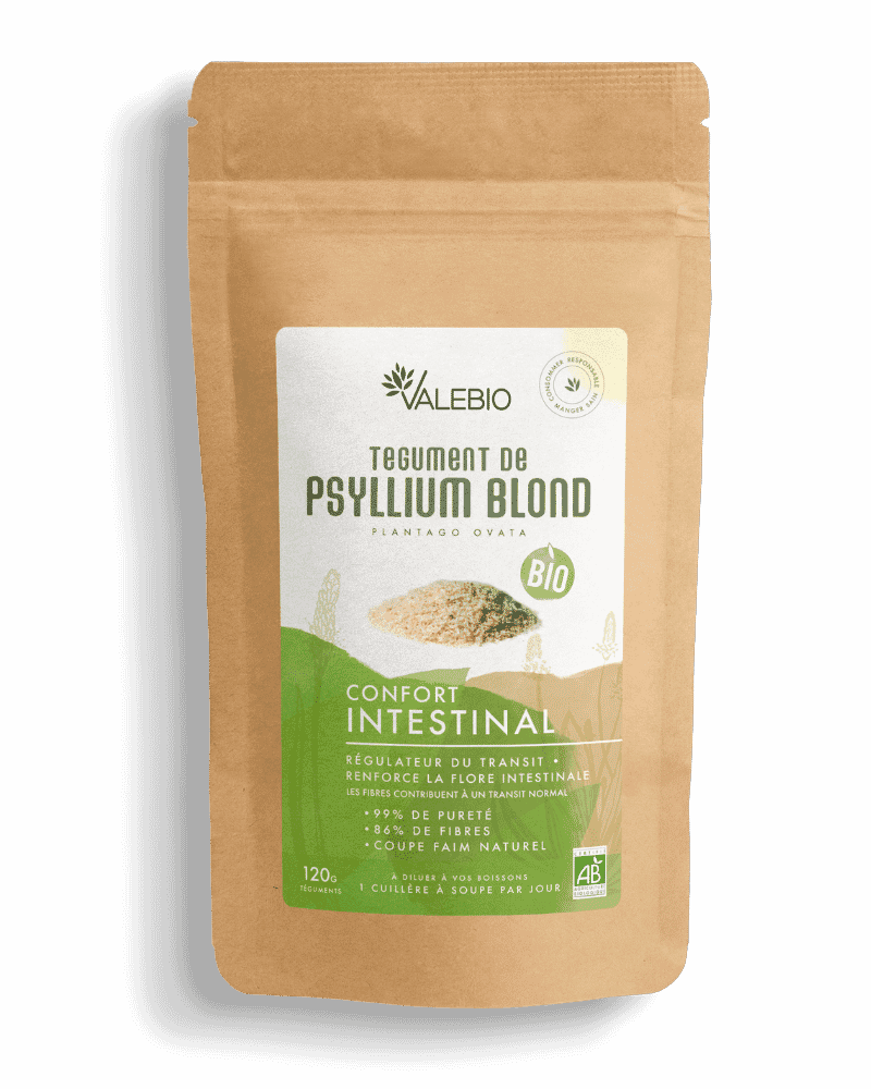 - Les fibres de tégument de psyllium contribuent à la régularité du transit intestinal.