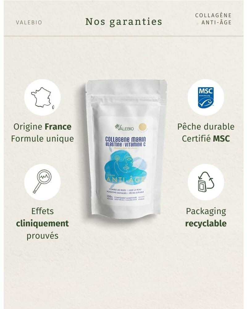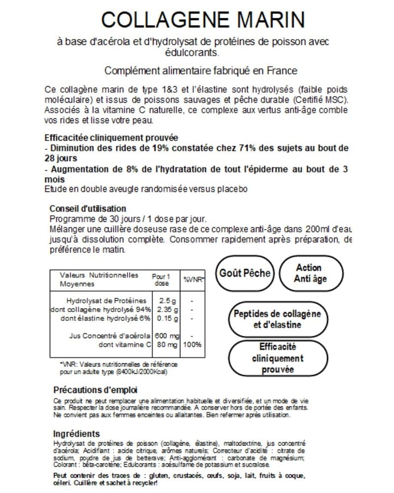 - Collagène marin hydrolysé (certifié MSC Pêche durable) qui contient : Source de peptides bioactifs qui stimulent la production naturelle de collagène.