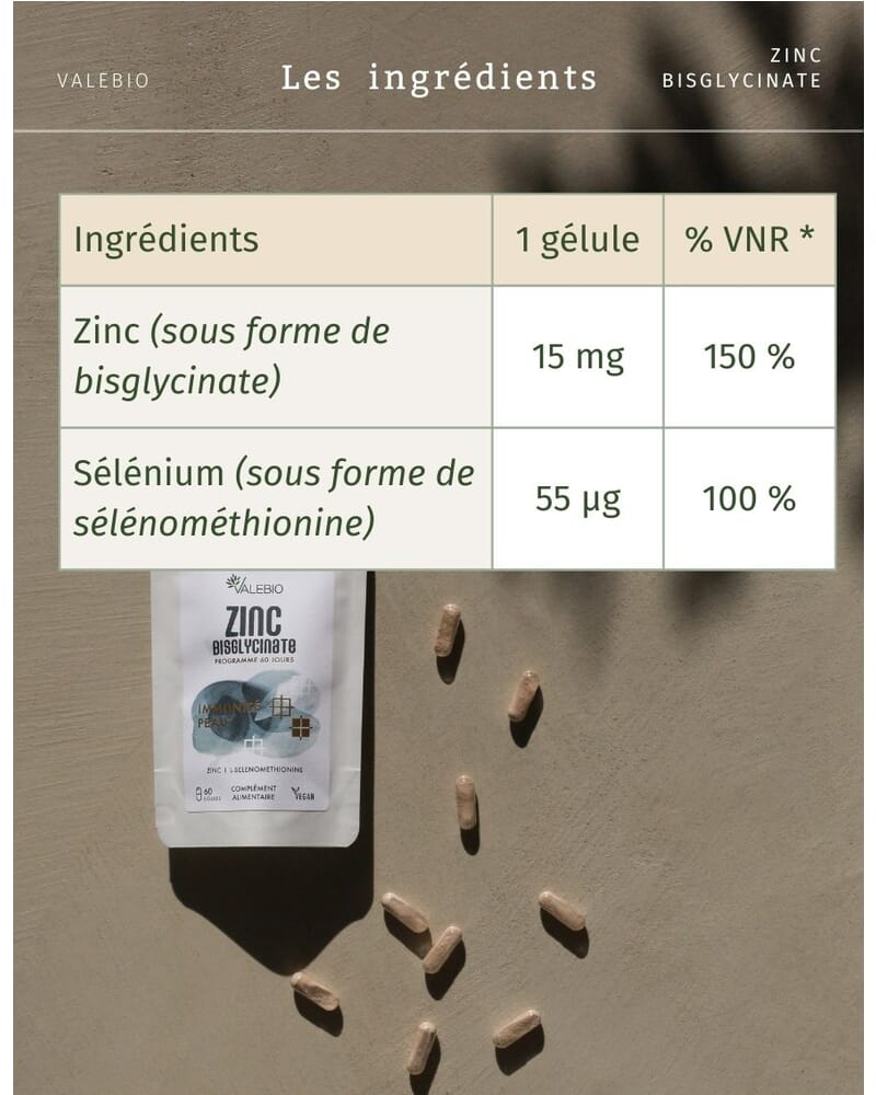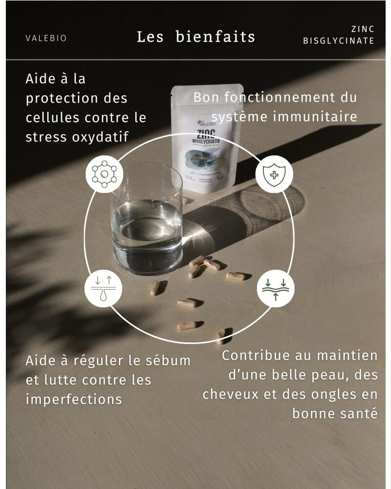 Le zinc est un oligo-élément indispensable au bon fonctionnement de notre organisme. Sous sa forme Bisglycinate, il contribue :
