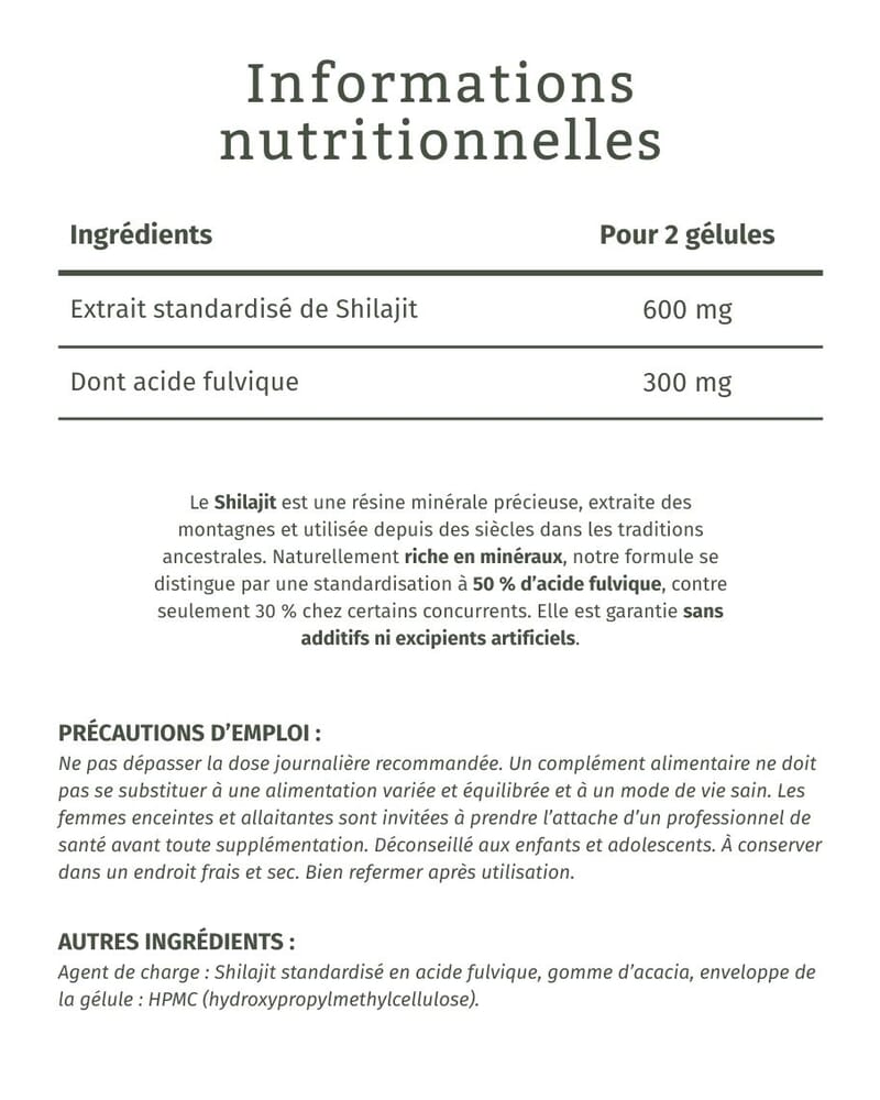 2 gélules Quantité Extrait standardisé de Shilajit 600 mg Dont acide fulvique 300 mg Ingrédients : Agent de charge : Shilajit standardisé en acide fulvique, gomme d’acacia, enveloppe de la gélule : HPMC (hydroxypropylmethylcellulose).