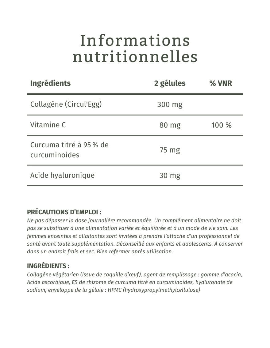 Vitamine C (80 mg – 100 % VNR)Antioxydant essentiel à la synthèse du collagène par l’organisme. Elle protège les cellules contre le stress oxydatif et soutient la régénération des cartilages.Ingrédients 2 gélules % VNR* Collagène (Circul’egg) 300 mg - - Dont Élastine 75 mg - - Dont GAG (Glucosamine et chondroïtine) 18 mg - - Dont Acide Hyaluronique 12 mg - Vitamine C 80 mg 100 % Curcuma (titré à 95 % curcuminoïdes) 75 mg - Acide hyaluronique 30 mg - Ingrédients : Collagène végétarien (issu de coquille d'œufs), agent de remplissage : gomme d'acacia, acide ascorbique, extrait sec de rhizome de curcuma titré en curcuminoïdes, hyaluronate de sodium, enveloppe de la gélule : HMPC (hydroxypropylmethycellulose).