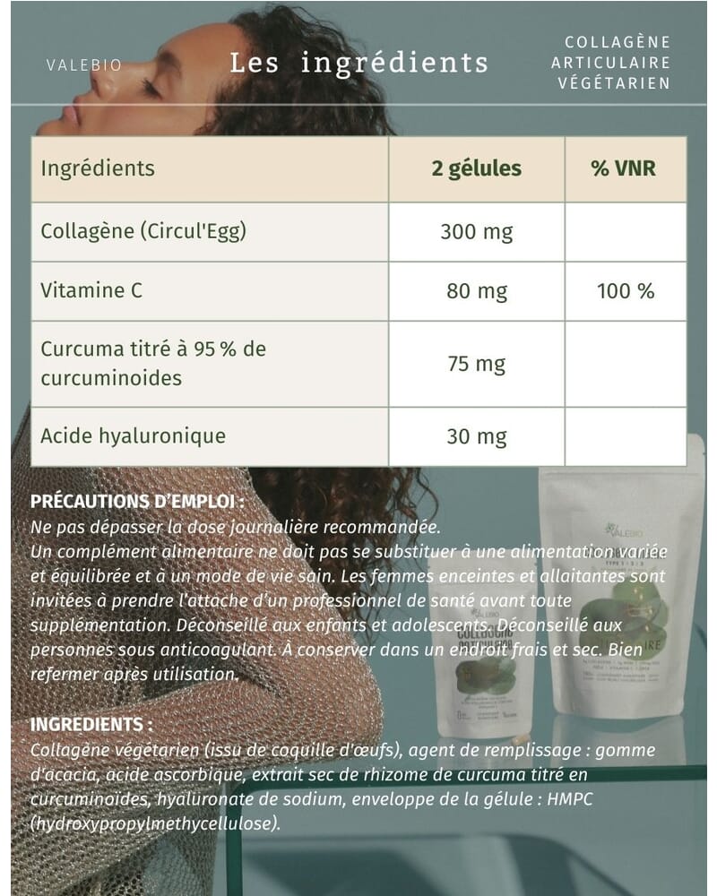 Vitamine C (80 mg – 100 % VNR)Antioxydant essentiel à la synthèse du collagène par l’organisme. Elle protège les cellules contre le stress oxydatif et soutient la régénération des cartilages.Ingrédients 2 gélules % VNR* Collagène (Circul’egg) 300 mg - - Dont Élastine 75 mg - - Dont GAG (Glucosamine et chondroïtine) 18 mg - - Dont Acide Hyaluronique 12 mg - Vitamine C 80 mg 100 % Curcuma (titré à 95 % curcuminoïdes) 75 mg - Acide hyaluronique 30 mg - Ingrédients : Collagène végétarien (issu de coquille d'œufs), agent de remplissage : gomme d'acacia, acide ascorbique, extrait sec de rhizome de curcuma titré en curcuminoïdes, hyaluronate de sodium, enveloppe de la gélule : HMPC (hydroxypropylmethycellulose).