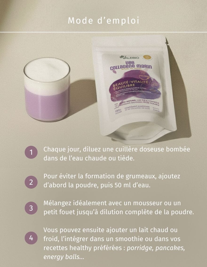 Mélangez 1 cuillère à café d'Ube Collagène Marin dans un verre de lait (végétal ou animal). Versez le reste du lait. Mélangez bien avec un petit mousseur ou un fouet, puis dégustez.