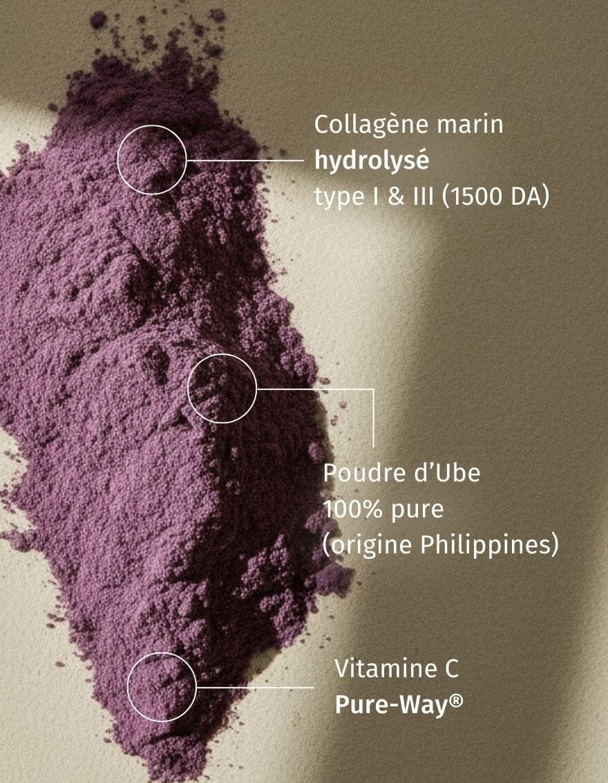 Cette formule associe deux ingrédients d’exception — l’ube, trésor violet venu des Philippines, et le collagène marin hydrolysé, reconnu pour ses effets prouvés sur la peau. Ensemble, ils agissent en synergie pour hydrater, protéger et illuminer la peau, tout en apportant une énergie douce et naturelle au quotidien.
