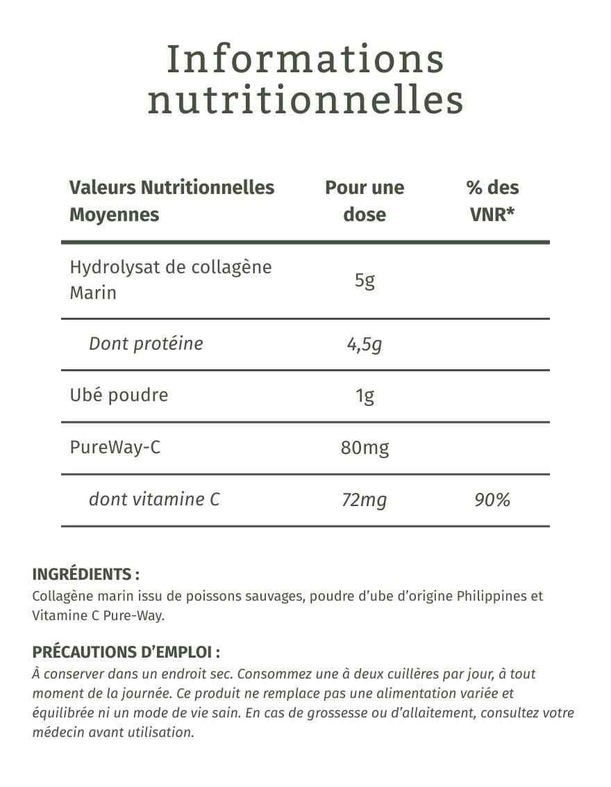 Vitamine C Pure-WayElle aide à réduire la fatigue et contribue à la formation normale du collagène dans l'organisme.Valeurs Nutritionnelles Moyennes Pour une dose % des VNR* Hydrolysat de collagène Marin 5g Dont protéine 4,5g Ubé poudre 1g PureWay-C 80mg dont vitamine C 72mg 90% Ingrédients : Collagène marin issu de poissons sauvages, poudre d’ube d’origine Philippines et Vitamine C Pure-Way.