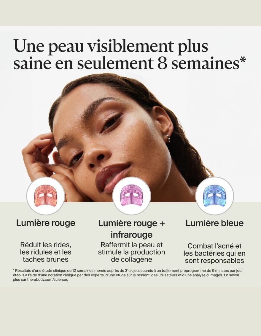 Le TheraFace Mask Glo est soutenu par la plus grande étude clinique réalisée à ce jour sur un masque LED facial grand public, avec 104 participants, des mesures instrumentales, de l’imagerie avancée et des évaluations expertes. C’est un gage de crédibilité scientifique et de sérieux.