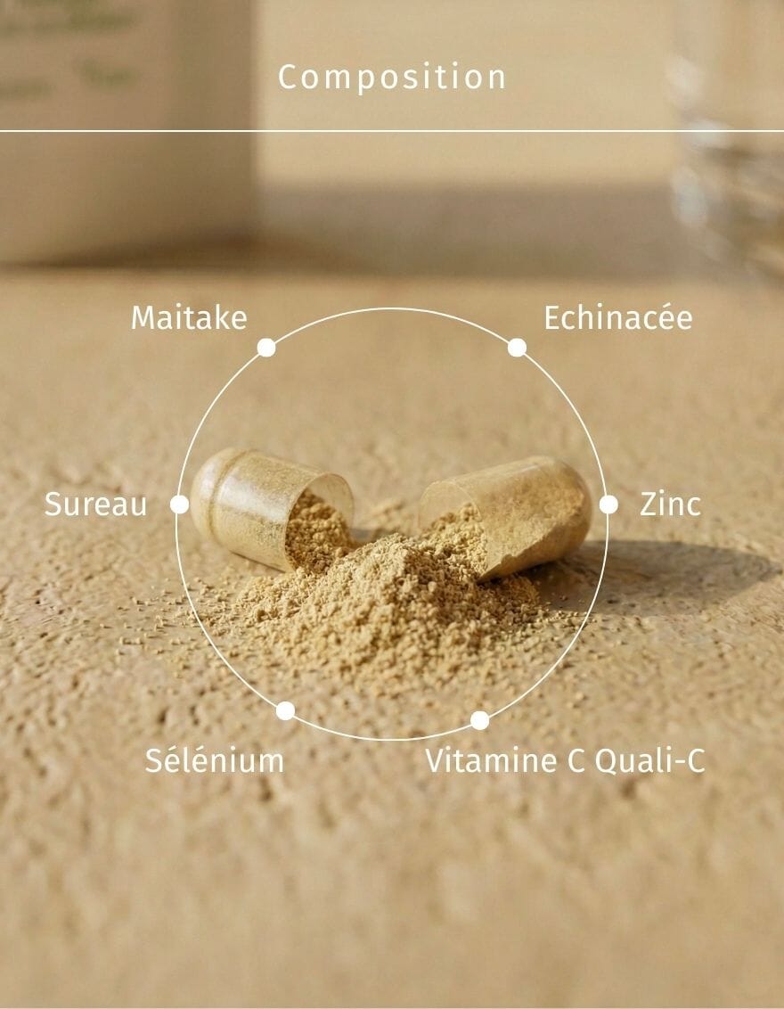 - Synergie 100% naturelle : maitake, échinacée et sureau associés à des micronutriments hautement biodisponibles, sans additifs.