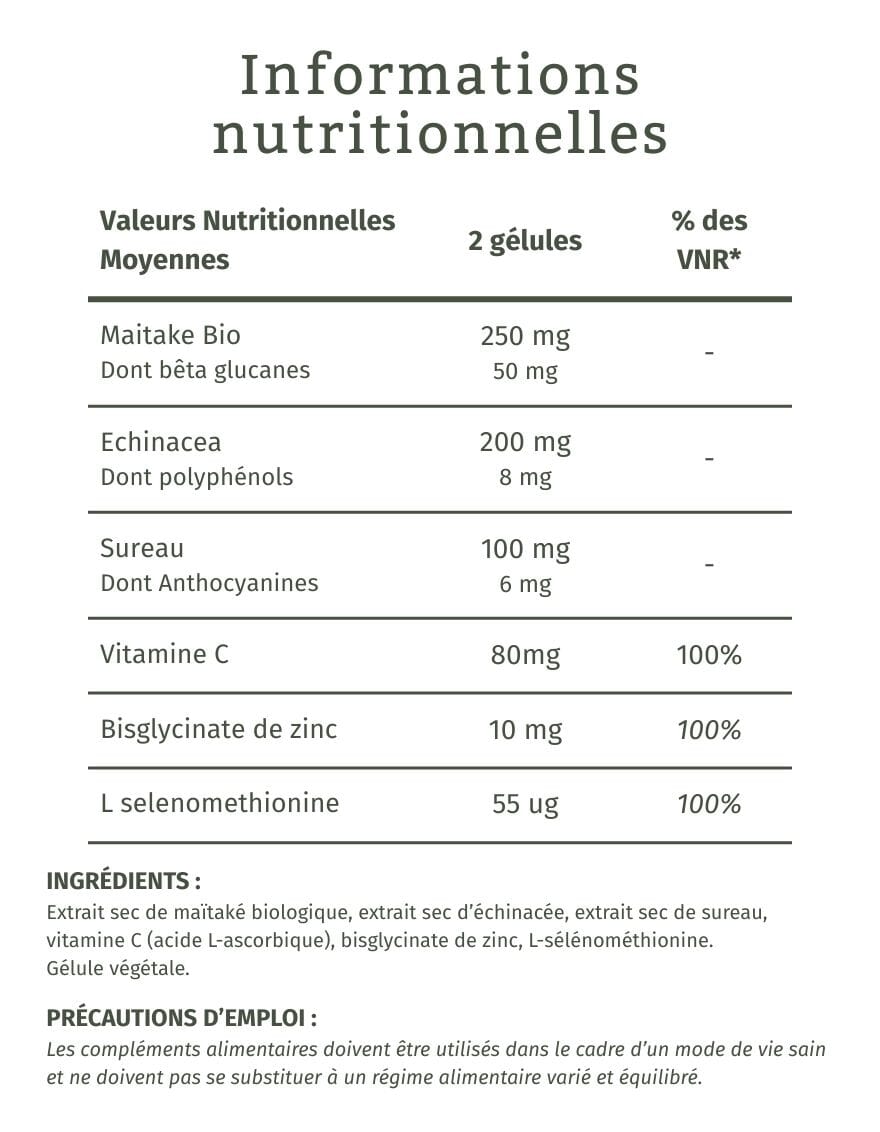 Ingrédients : Extrait sec de maïtaké biologique, extrait sec d’échinacée, extrait sec de sureau, vitamine C (acide L-ascorbique), bisglycinate de zinc, L-sélénométhionine. Gélule végétale.