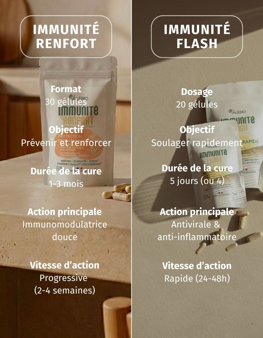 Immunité Renfort a été formulé pour un soutien régulier et durable sur 30 jours minimum, alors qu’un produit “flash” vise plutôt une action courte sur quelques jours lors des premiers signes hivernaux.