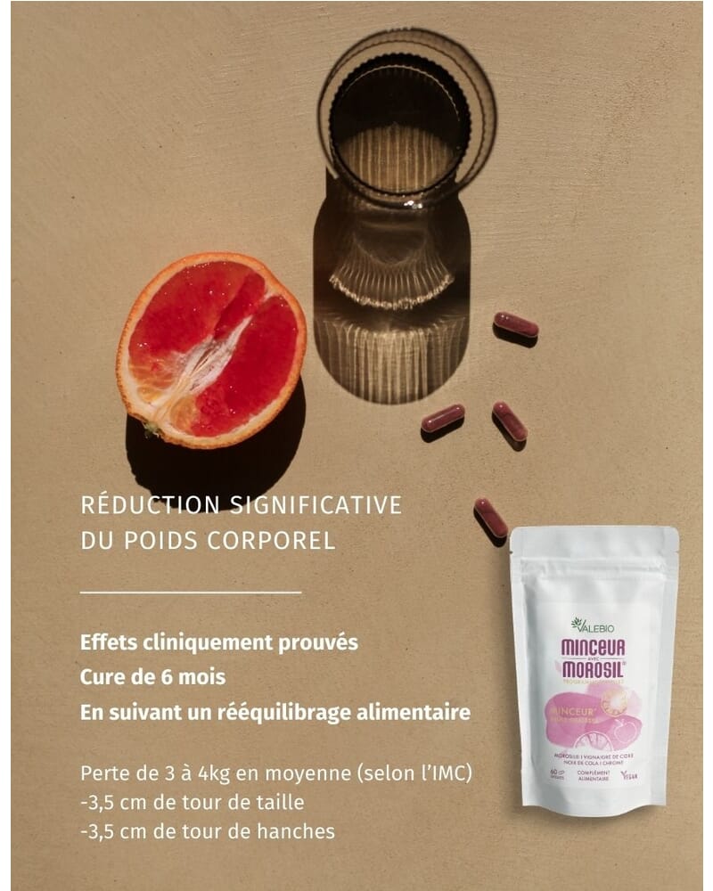 - Action brûle-graisse : Notre produit minceur avec Morosil™ aide à réduire la masse graisseuse (-3,5 cm de tour de taille et de hanches et perte de 3 à 4 kg en moyenne selon l'étude clinique des effets du Morosil™).