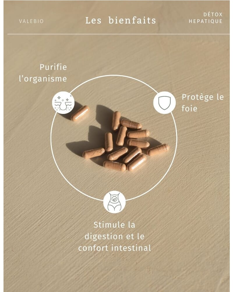 La Détox Hépatique Valebio® combine des actifs brevetés comme Hepure™, des plantes comme le chardon-marie titré en silymarine et le glutathion pour une action ciblée sur le foie, avec un packaging écoresponsable et une formule 100 % vegan. -