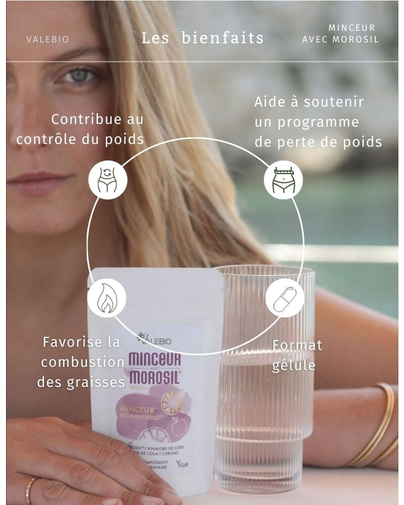Le complément Minceur avec Morosil® se distingue par la présence d’un actif breveté ayant fait l’objet de deux études cliniques démontrant son efficacité sur la minceur. En plus de favoriser la réduction de la masse grasse, il contribue à réguler la glycémie, aidant ainsi à stabiliser les niveaux de sucre dans le sang. De plus, ce complément ne contient ni nanoparticules ni excipients à effet notoire, garantissant ainsi une formulation sûre et respectueuse de l'organisme.