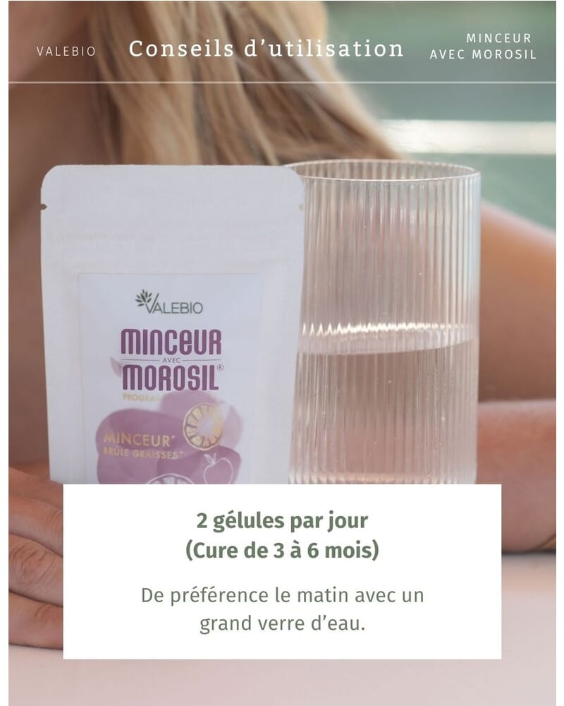 - Minceur avec Morosil™ : 2 gélules par jour, de préférence le matin, avec un grand verre d’eau. Cure de 3 à 6 mois recommandées.
