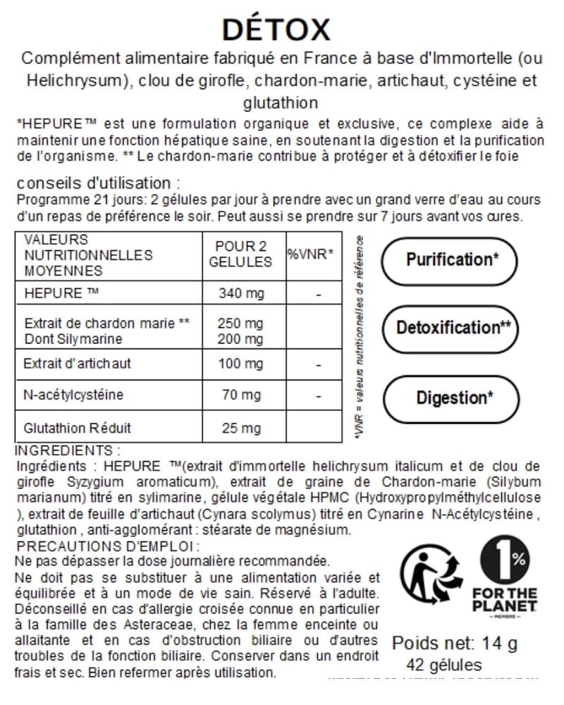 Ingrédients Quantité / 2 gélules % VNR Hepure™ 340 mg - Extrait de chardon-marie 250 mg - Dont silymarine 200 mg - Extrait d’artichaut 100 mg - N-acétylcystéine 70 mg - Glutathion réduit 25 mg - Ingrédients : HEPURE ™ (extrait d'immortelle helichrysum italicum et de clou de girofle Syzygium aromaticum), extrait de graine de Chardon-marie (Silybum marianum) titré en sylimarine, gélule végétale HPMC (Hydroxypropylméthylcellulose), extrait de feuille d’artichaut (Cynara scolymus) titré en Cynarine N-Acétylcystéine, glutathion, anti-agglomérant : stéarate de magnésium.