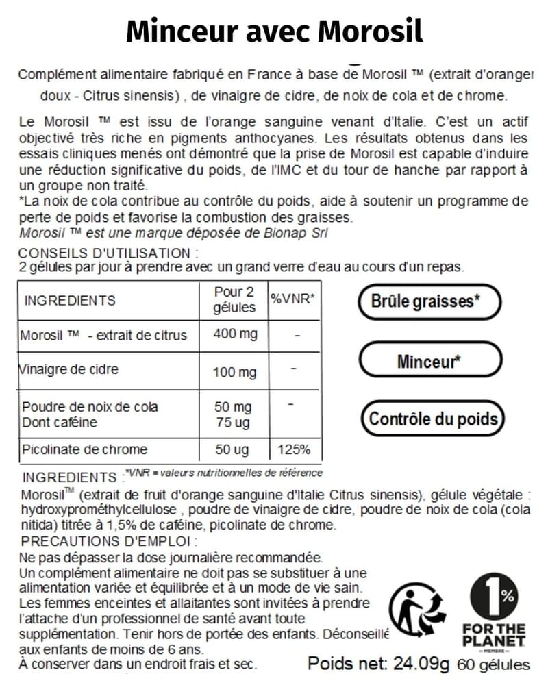 Ingrédients 2 gélules % VNR * Morosil - extrait de citrus sinensis 400 mg Vinaigre de cidre 100 mg Poudre de noix de cola